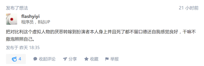 当然,最令人生草的是最后一段有关比尔的言论,唐人认为,批判比尔的人是在“把对比尔这个虚构形象的不满转嫁到无关的原型人物上”,真是弱智不堪。由此可见,唐人是完全不懂レ爱好者到底是在批判什么,也不懂新日暮里世界观中关于角色本位面及其投影的关系,纯粹是自以为批判比尔的人都是对比尔王这个角色不满从而迁怒到本尊比尔海灵顿身上。然而レ爱好者完完全全是在批判比尔本尊一边辱华一边来华捞金的死妈行为,身为猴站五位数兼屑站六级的一键贵畜大手子竟然不知道レ的历史、搞不懂楚批判的缘由、分不清是本尊招黑还是角色招黑,唐人不愧是个啥都不懂或一知半解就指点江山的弱智。值得一提的是,该回答被折叠后,唐人盛怒之下又发了一条想法继续对着空气嘴臭,并坚持认为批判比尔的都是在讨厌比尔这个虚拟人物,可惜嘴臭唐人难逃支忽一杀,该想法也被一瞬橄榄,笔者在此也希望唐人能自己撒泡尿照照自己的弱智模样。