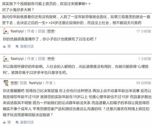 仗着自己超过30岁,唐人曾打算让人称呼自己一叔(婶),而且在与他人辩驳处于下风时常常一转无关的年龄话题,企图依靠33岁高龄碾压对手取得精神胜利,然而这种倚老卖老的行为在高雅人士眼里无非像个弱智。有一次,唐人在支忽自己的关于屑站问题的回答下与一位正义路人发生争论,几个回合后唐人气急败坏再次脑补对方年龄是二十出头,企图表明自己越老越有理,此举令这位正义路人困惑的同时也让他认为喜欢拿年龄说事的唐人根本不像成年人,不过在这里笔者要告诉这位正义路人,唐人真的是超过了15岁而且要翻倍的年龄。另外,在与高雅人士的一次对话中,高雅人士报上“24歳、学生です”时,唐人表示24岁还不是无可救药,可以向三观极正的它学习。真是老唐人无药可救