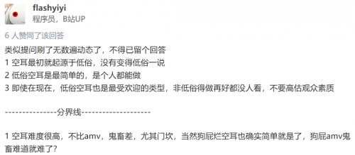 然而,就是这样一位低俗人士,竟有脸对着“恶俗人士”指手画脚,还自认为其低俗空耳的制作难度堪比AMV和贵畜,不知其迷之自信从何而来。直接放动画OP/ED原片加低俗空耳字幕的制作难度比需要剪辑的另外两项高?笑死。另外,从这些空耳视频和支忽回答可以推测唐人并不懂日语(常说什么日语十级),这一推测在之后得到进一步证实。