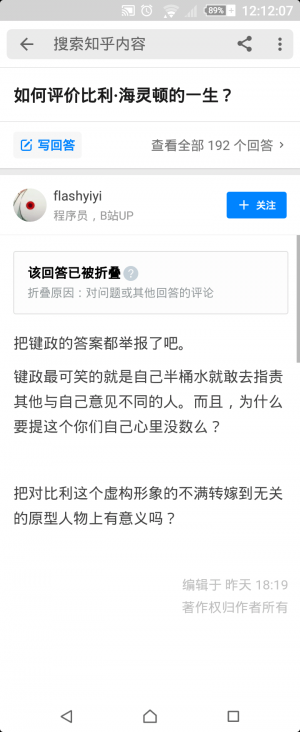 该回答确实令人眼前一亮,在三个段落中,唐人首先是号召其他人举报所谓的“键政的答案”,然后自己也对“键政”批判了一番,最后批判了批判比尔的人,完美华丽。然而,在当时的热门回答中,绝大多数讨论和批判比尔辱华的用户并没有表达自己的政治立场,笔者在其他回答中也没有见到有几个所谓的“键政”相关,多数人都仅仅是针对比尔的辱华事实作出评价,唐人唐突批判“键政”是出于何意?是觉得自己维护支忽风气很正义,还是认为讨论辱华就是键政?笔者暂且蒙在鼓里。不过毫无疑问的是,唐人依旧是个答非所问且没有自知之明的KY废物,而所谓的“键政的答案”毫无笋丝,倒是唐人答非所问的回答被一瞬折叠,自嘲完美。